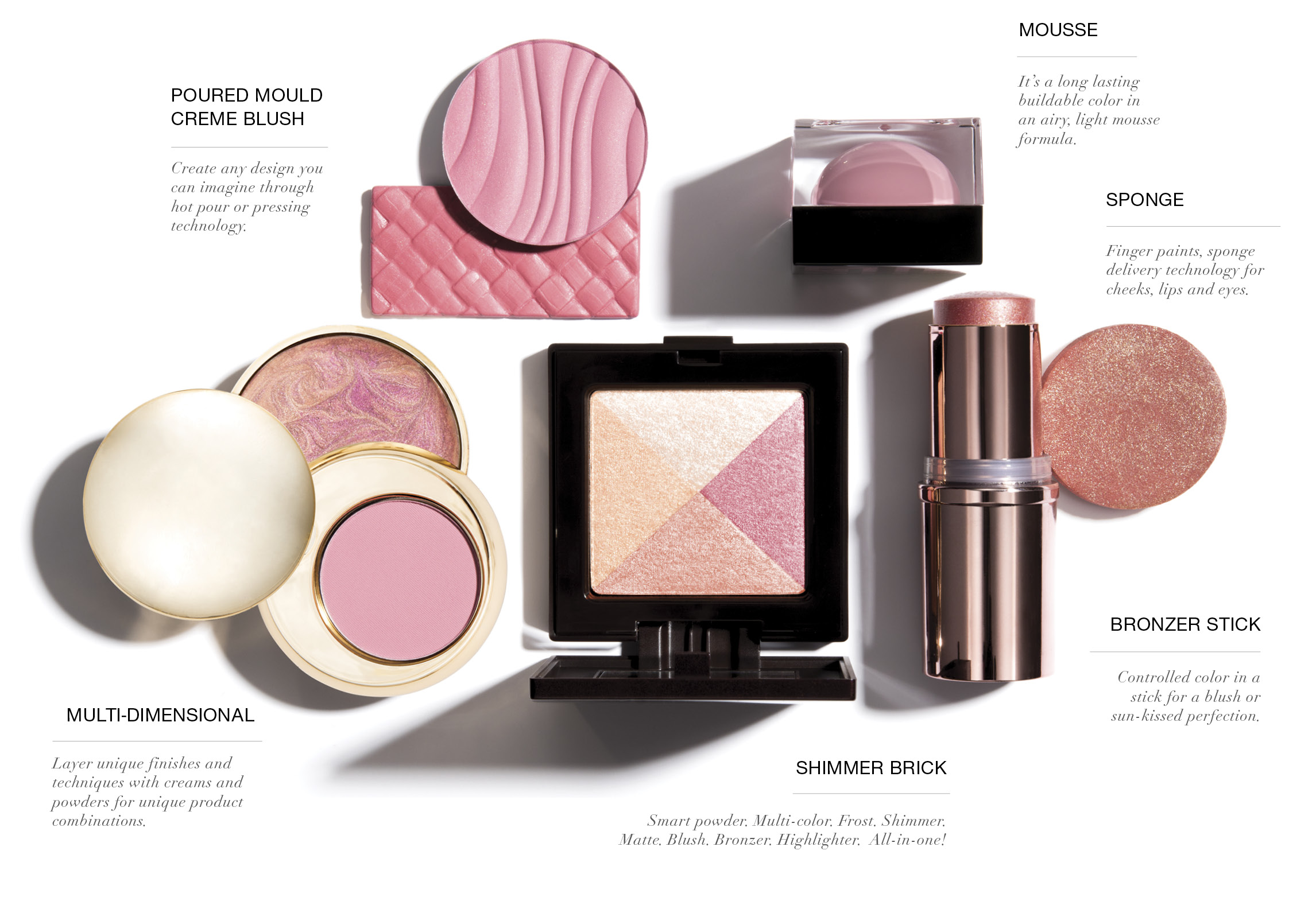 • Multi-Dimensional – Layer unique finishes and techniques with creams and powders for unique product combinations.