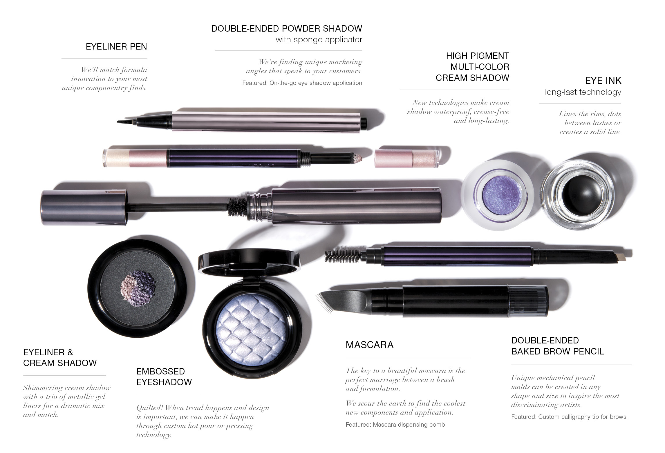• Eyeliner Pen – We’ll match formula innovation to your most unique componentry finds.