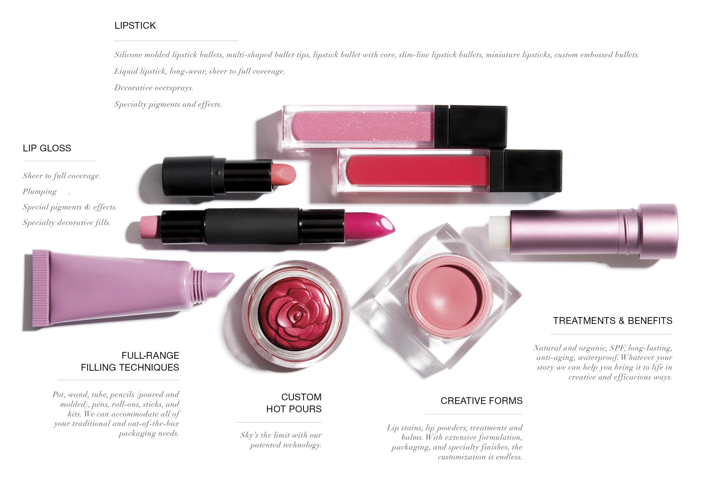Creative Forms – Lip stains, lip powders, treatments and balms. With extensive formulation, packaging, and specialty finishes, the customization is endless.